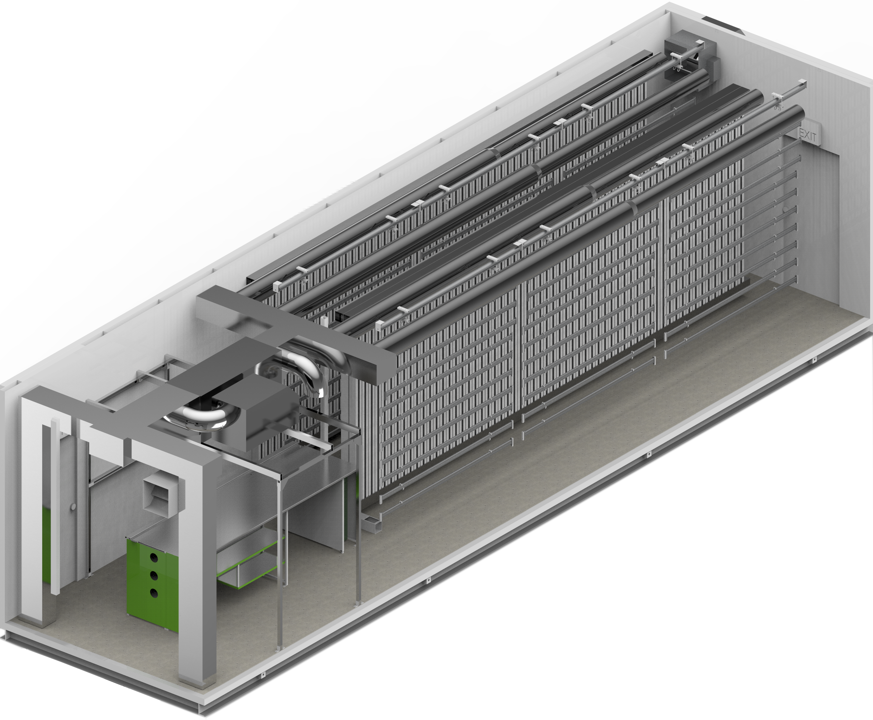 The Primary Module is a purpose-built container designed with farmers in mind. The 40’ x 10’ x 10’ footprint allows for increased air circulation and crop yields when compared to shipping container farms. Built with composite, rust-resistant panels, the Primary Module can operate anywhere on earth.